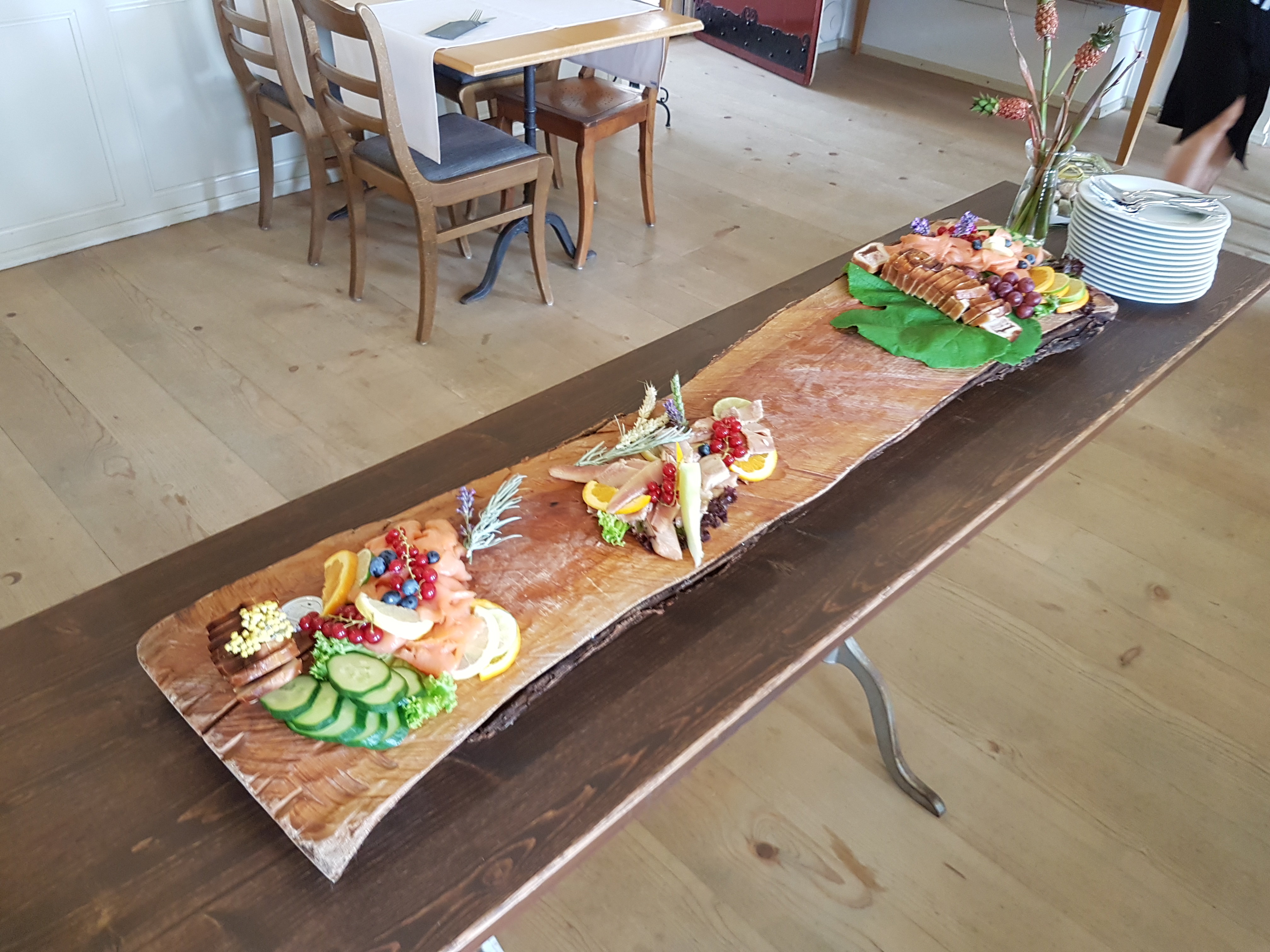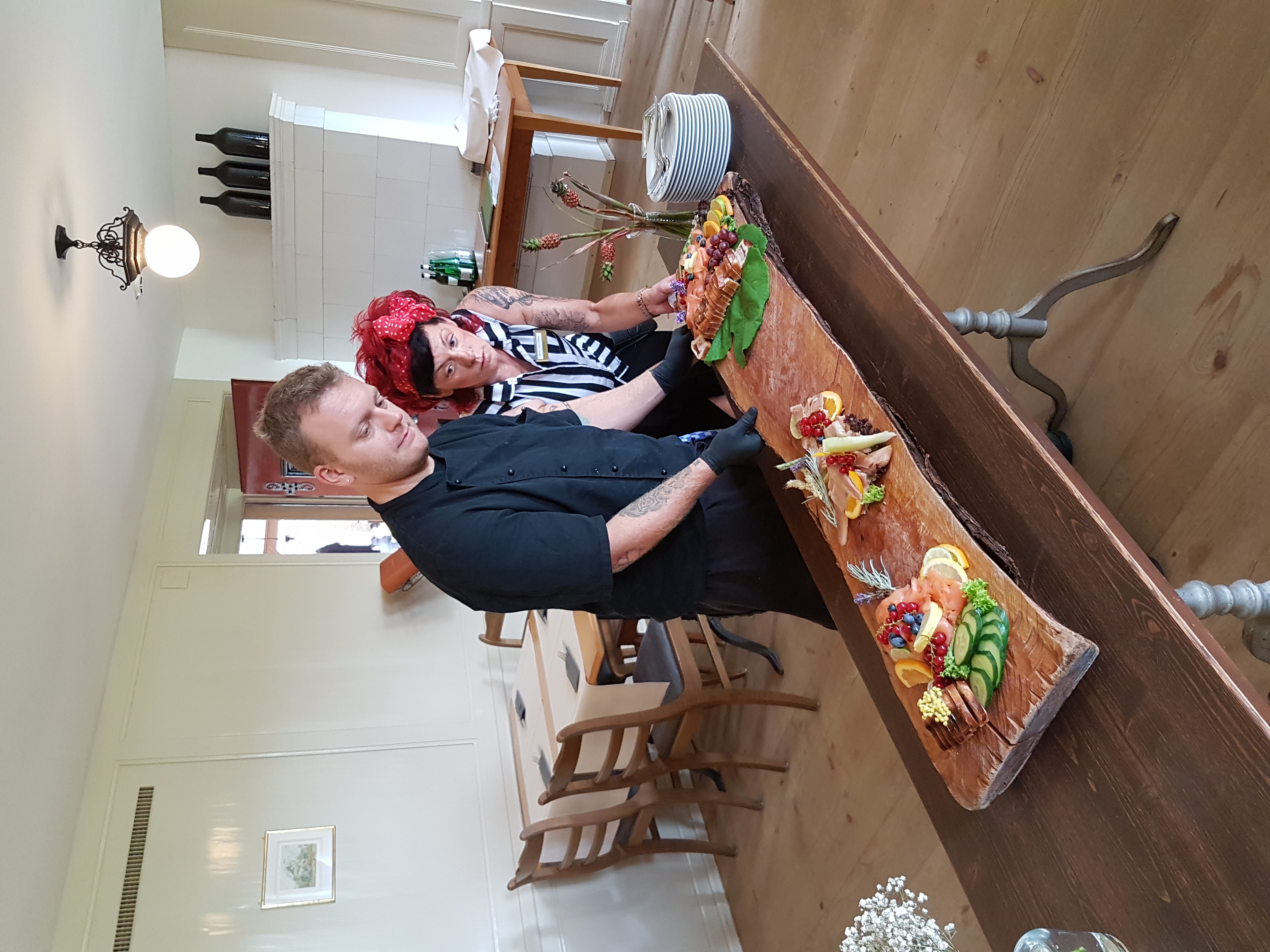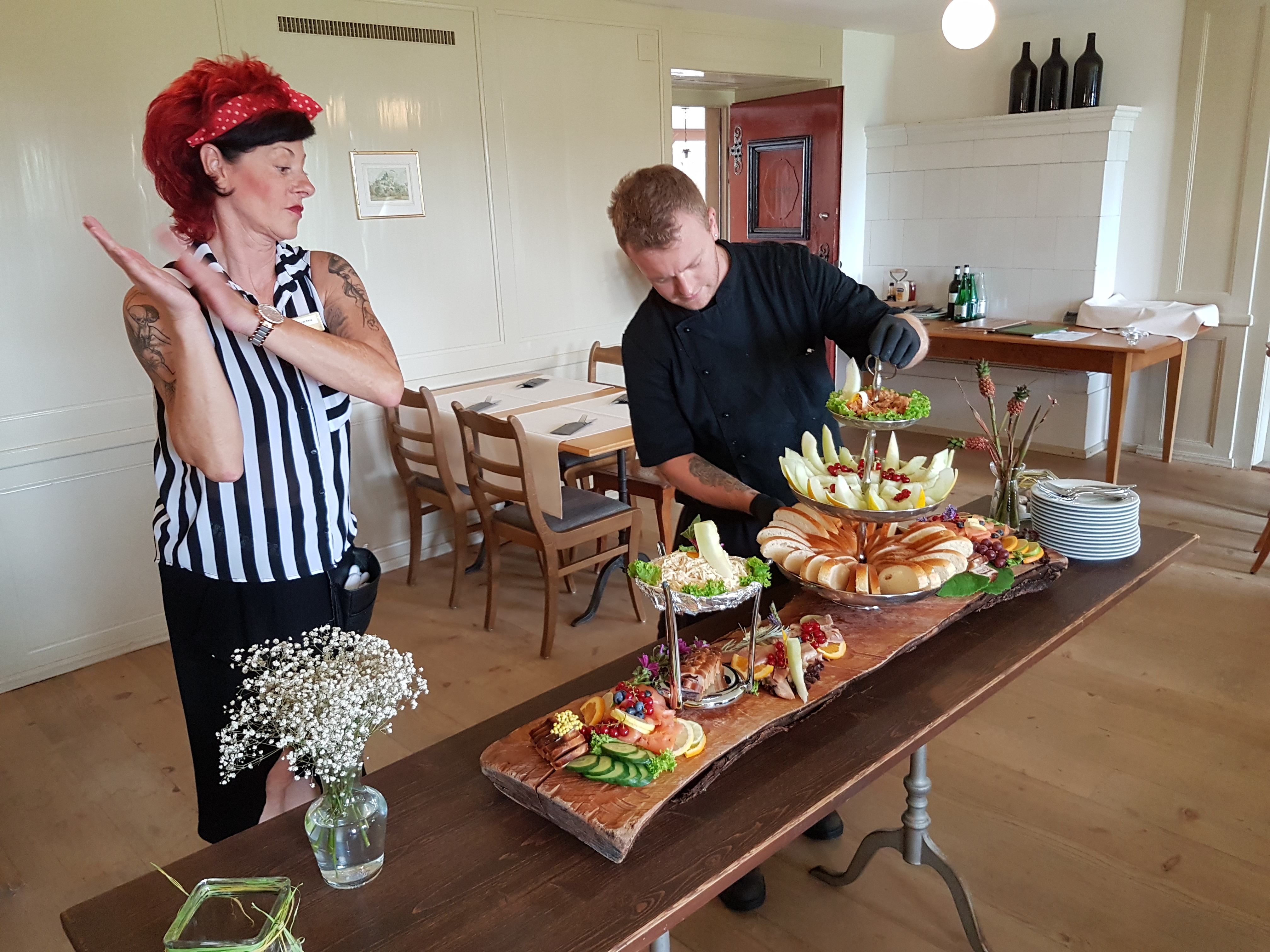 Menu : carrousel d’hors-d’oeuvre nordiques avec saumon fumé, truite fumée, pâté maison, melon, salade de céleri garnie, brioche et beurre – émincé de veau à la bernoise aux lardons, roestis et bouquet de légumes – bourses aux amandes sur ragoût de rhubarbe et mousse d’amandes –vin rouge de la région-