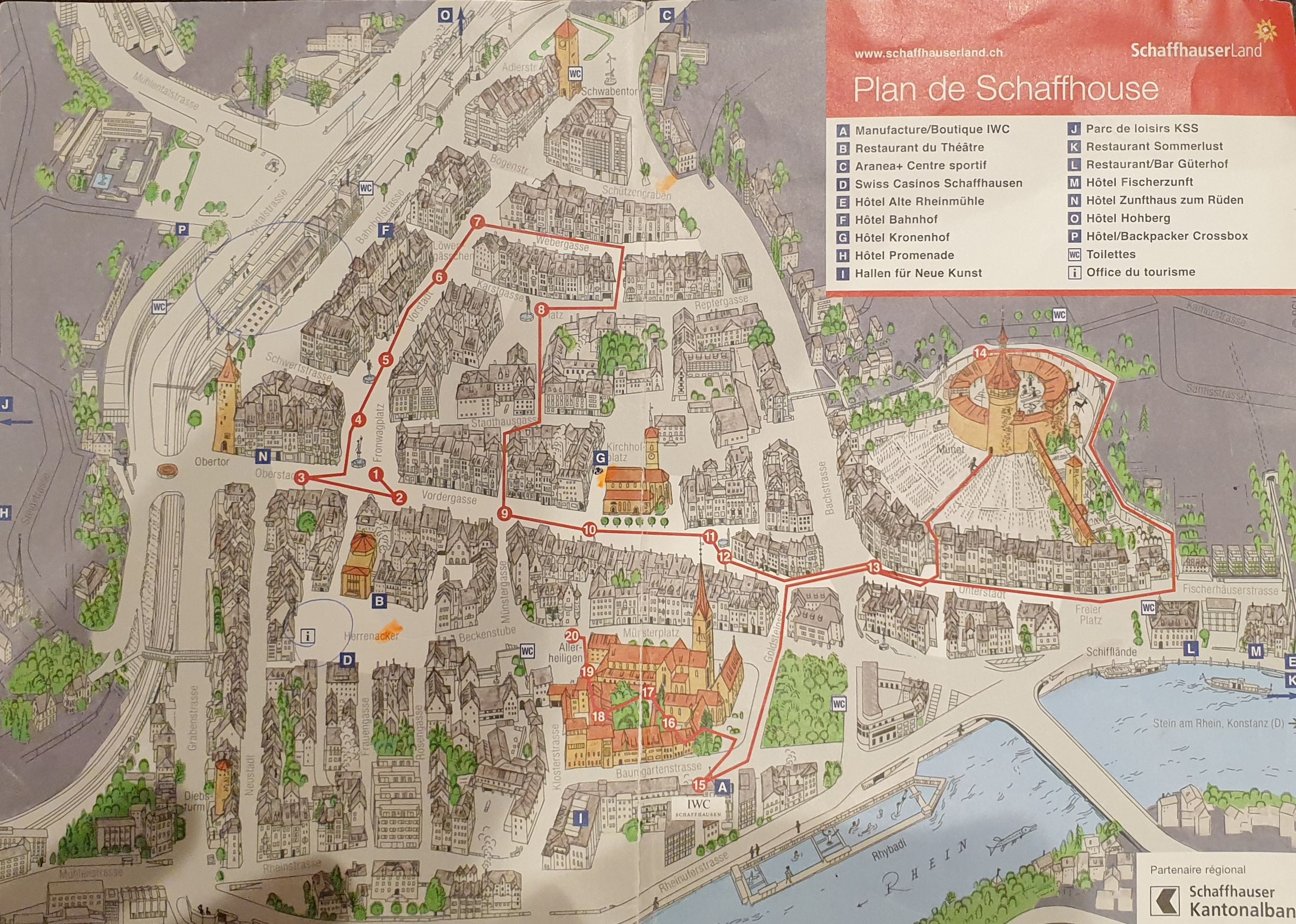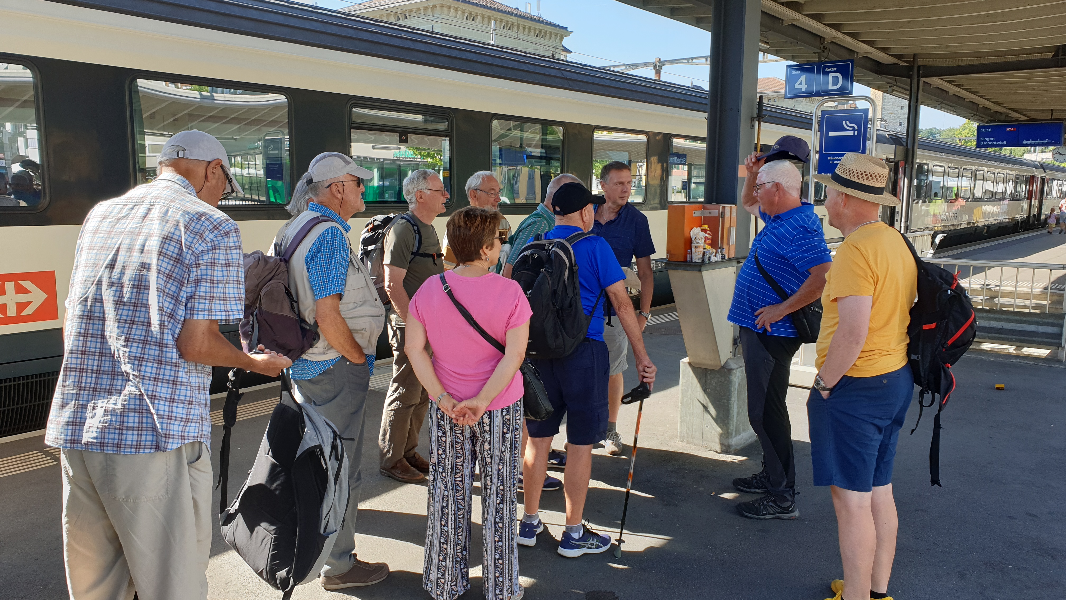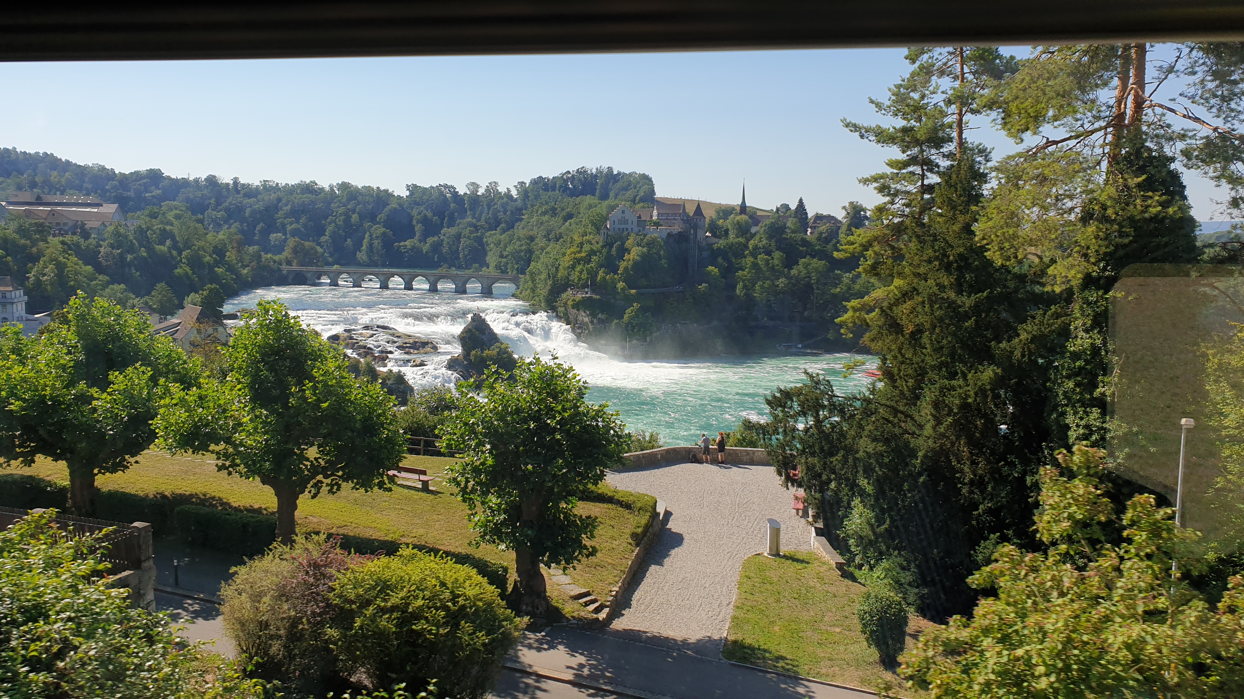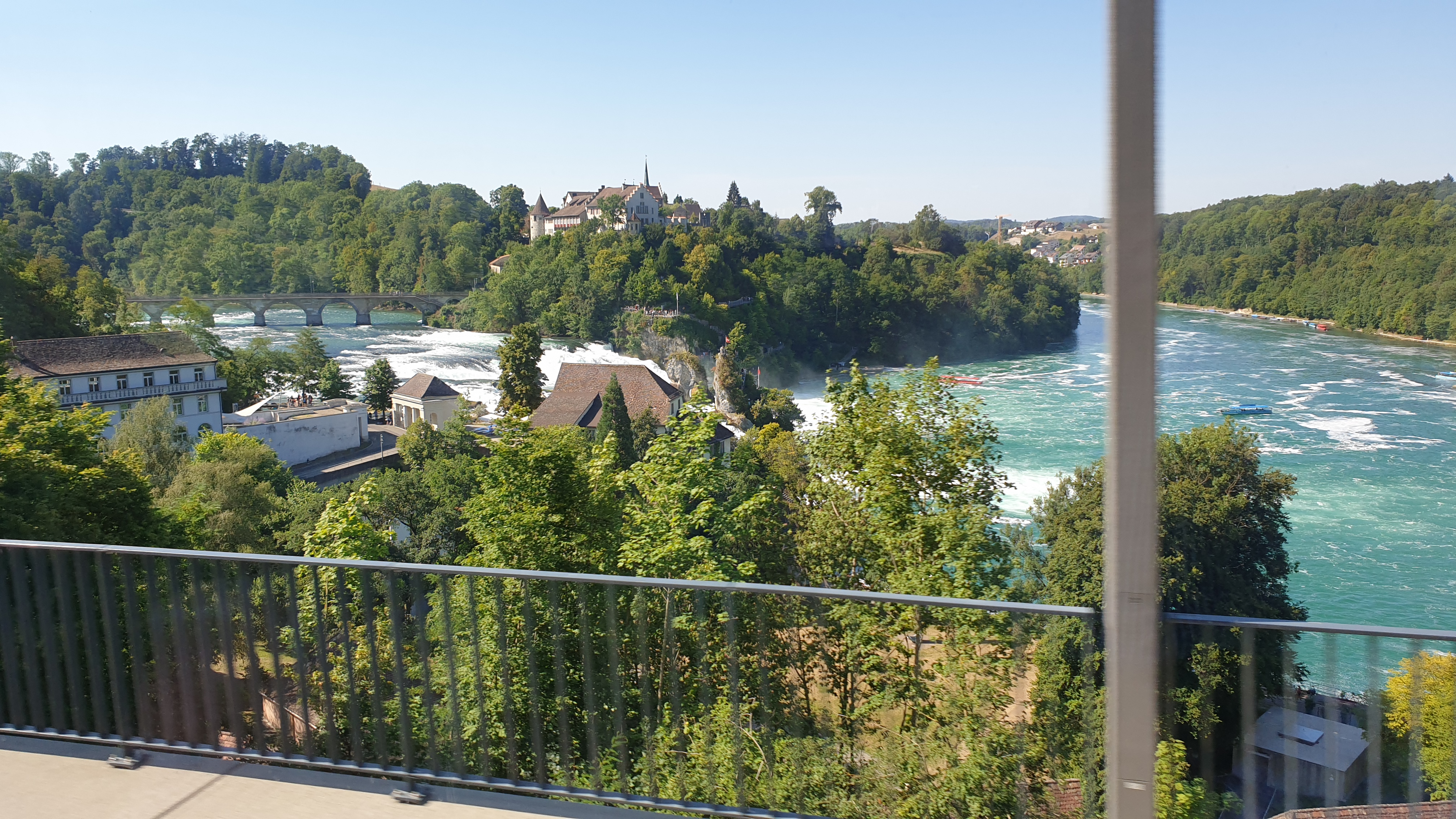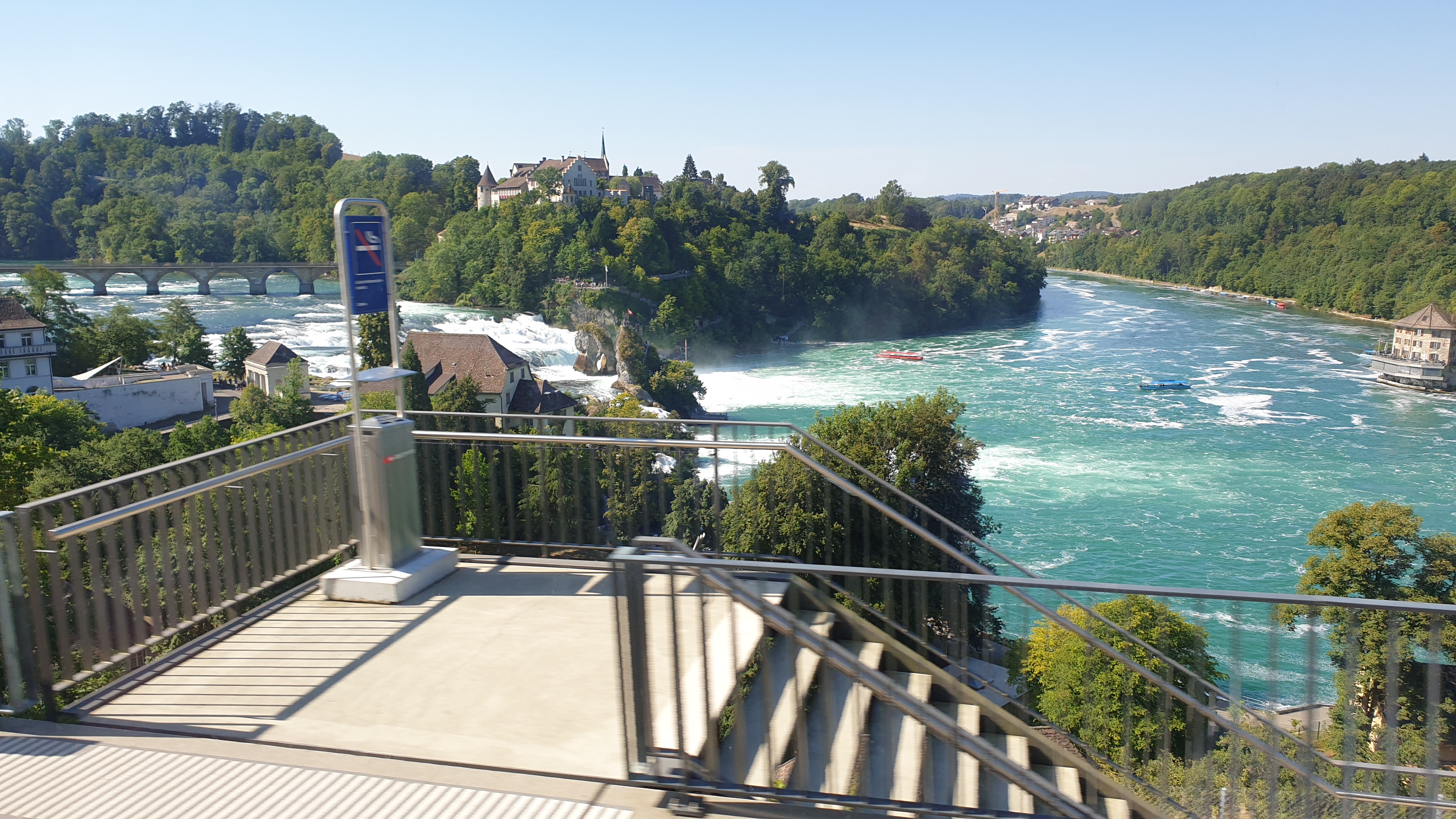 10h43 arrivée à Schaffhouse. Ensuite tour de ville à pied et montée au Munot, site historique. Apéro tiré des sacs. La montée au Munot est sportive, une centaine d’escaliers, mais au sommet la vue est magnifique. Bâtons conseillés. Les moins vaillants pourront se promener sur les rives du Rhin